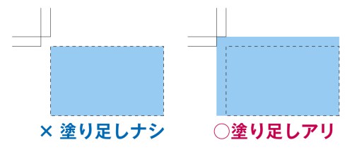 印刷機で出力された紙は、断裁時にわずかなズレが生じることがあります。そのズレによって、紙の端に白い線(地の色)が出てしまうのを防ぐために、仕上がりサイズより外側に背景や画像を3mm程度はみ出して配置する余白部分を「塗り足し」といいます。
